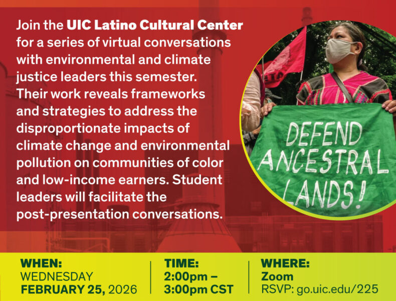 Join the UIC Latino Cultural Center for a series of virtual conversations with environmental and climate justice leaders this semester. Their work reveals frameworks and strategies to address the disproportionate impacts of climate change and environmental pollution on communities of color and low-income earners. Student leaders will facilitate the post-presentation conversations.